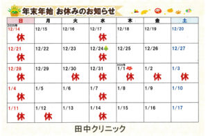 年末年始 お休みのお知らせ 公開済み: 2025年12月6日更新: 2025年12月12日作成者: seihoukai-tanakaカテゴリー: 未分類 当院は12/30(火)〜1/4(日)を年末年始休診とさせていただきます。 ご不便をおかけして大変恐縮ですが、ご理解いただければ幸いです。